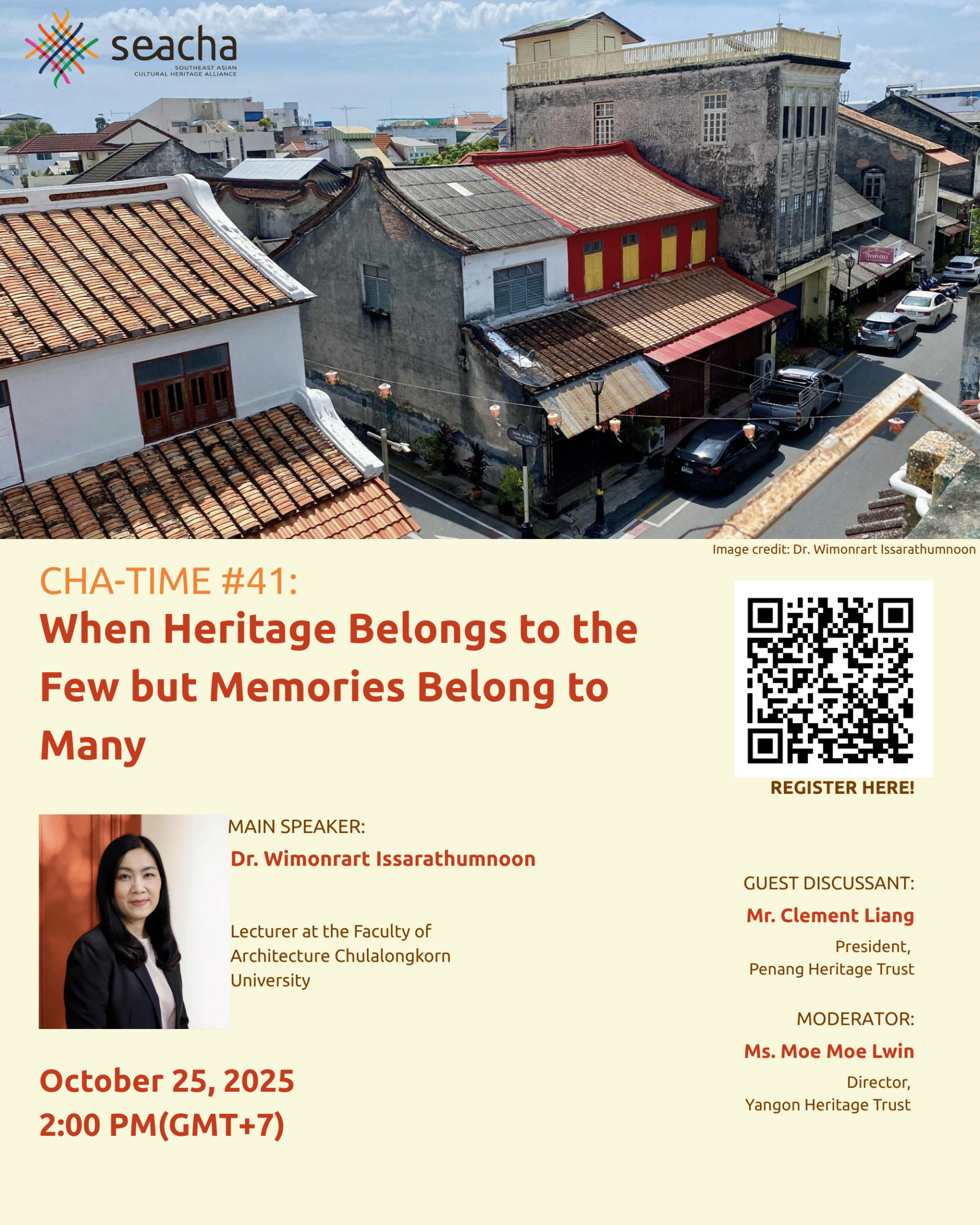 Cha-Time with SEACHA is a monthly program for sharing knowledge and expertise on common cultural heritage issues in Southeast Asian countries. Talks are held virtually on Saturday afternoons. The program lasts about an hour and a fifteen minutes each time, with a 20 minute presentation by a guest speaker and up to an hour for interactive discussion, roundtable chat, and Q&A with the audience. SEACHA founding members nominate speakers from their countries to present on topics that are relevant to the theme of the year.